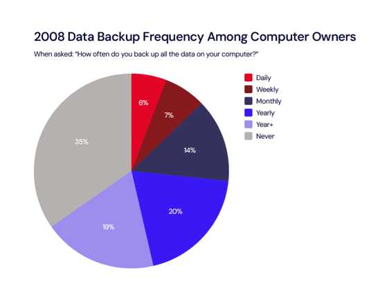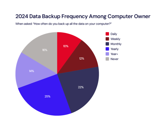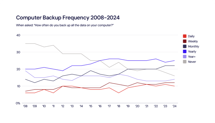 Additionally, there is a slight, but not statistically significant, increase of 1% in yearly and more-than-yearly backups. Notably, the percentage of people who have never backed up their data has decreased by 2%.
