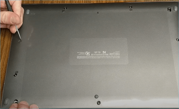 Step 2. Turn your laptop backside up, use tweezers to remove the rubber covers on the screws, and then use the screwdriver to remove the screws. You can put them together because these small utilities are easy to lose.