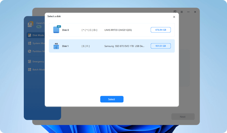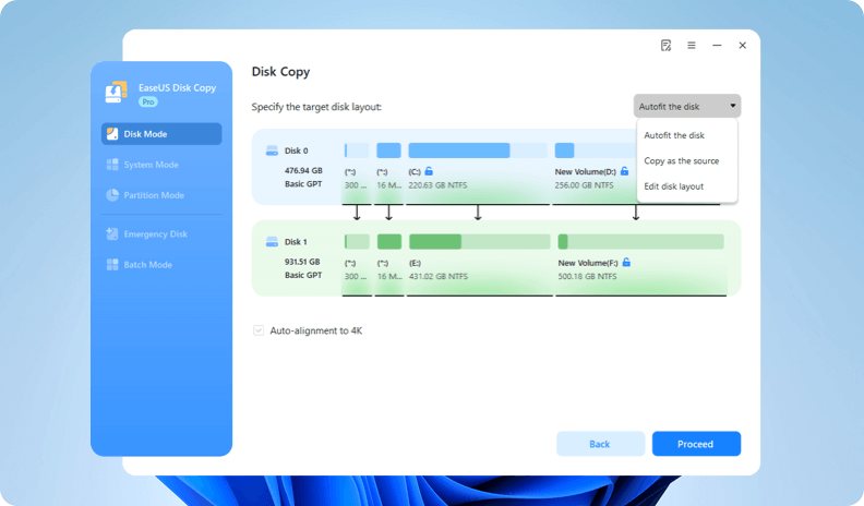Launch EaseUS Disk Copy, select the source disk under the Disk Mode.