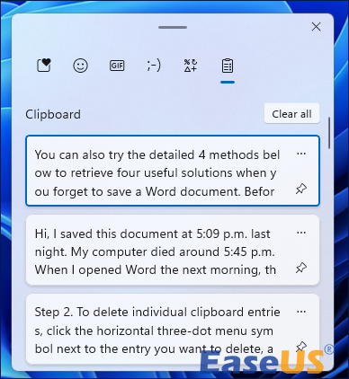 Step 3. All previously cut and paste messages, notes, photographs, screenshots, or other data can be seen after hitting Win + V to open the clipboard in Windows.