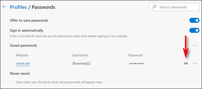 Locate the "Saved Passwords" section on the Passwords screen. You'll see a list of all the usernames and passwords you've selected to preserve in Edge. Passwords are masked by default for security reasons. To see a password, click the eye icon next to it.