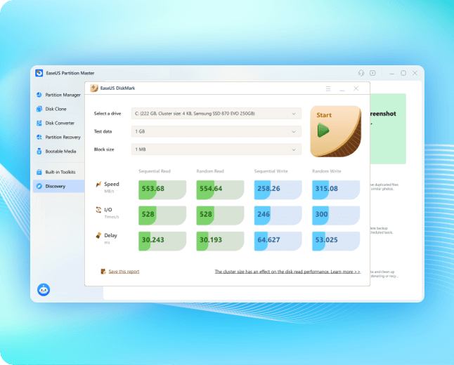 If you are looking for a free and reliable SSD benchmark tool, take EaseUS Partition Master for help. This software offers you with its Disk Mark feature, allowing you to test SSD speed and monitor its overall performance in a fast, secure, and simple manner. Your disk data is 100% secure with this free SSD benchmark tool.