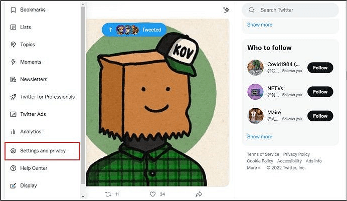 Step 1: Open your Twitter account on your computer and click the "More" button to select "Settings and privacy" from the available options.