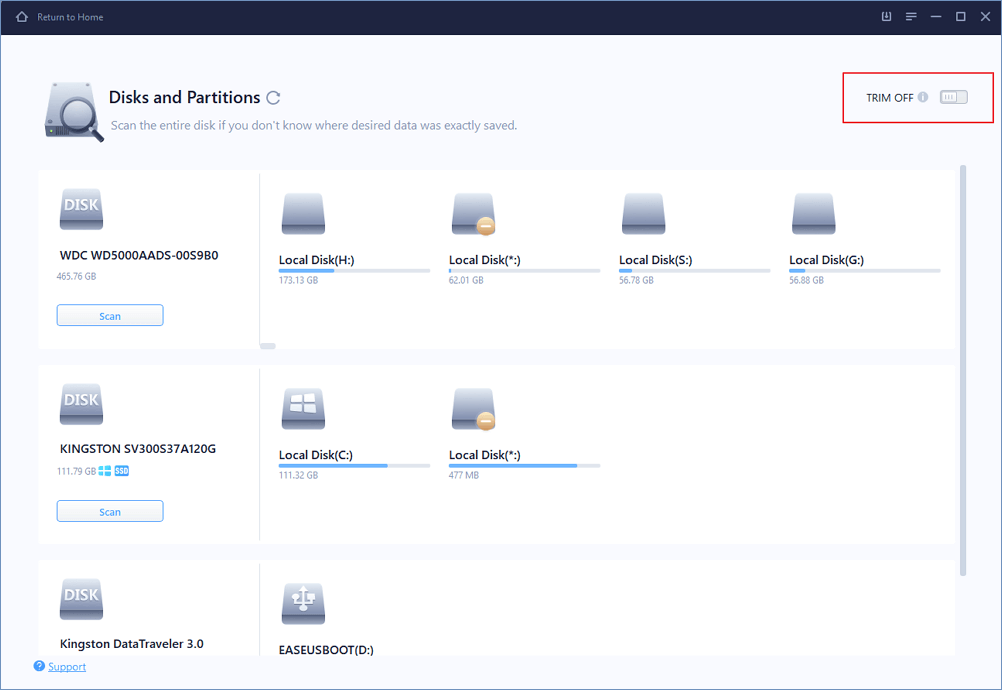 | Fix 3. More Guides on Data Recovery with SSD TRIM Enabled | TRIM ensures the high performance of your SSD, but it eliminates the possibility of data recovery on your device because it erases data instead of deleting...Full steps |