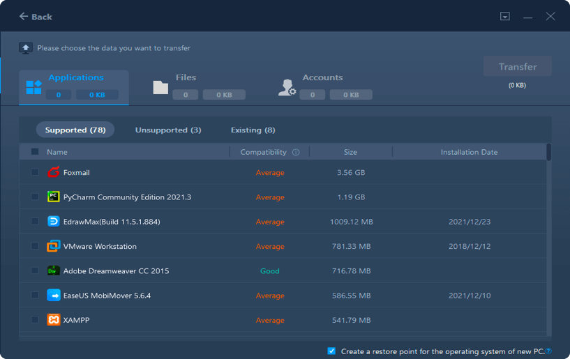 This PC transfer migration software can safely transfer programs from one computer to another. Also, it is an excellent way to transfer large files, especially those application files or server files that take up much disk space. It supports the most common applications/programs, including MS Office (Word, Excel, Outlook, etc.)