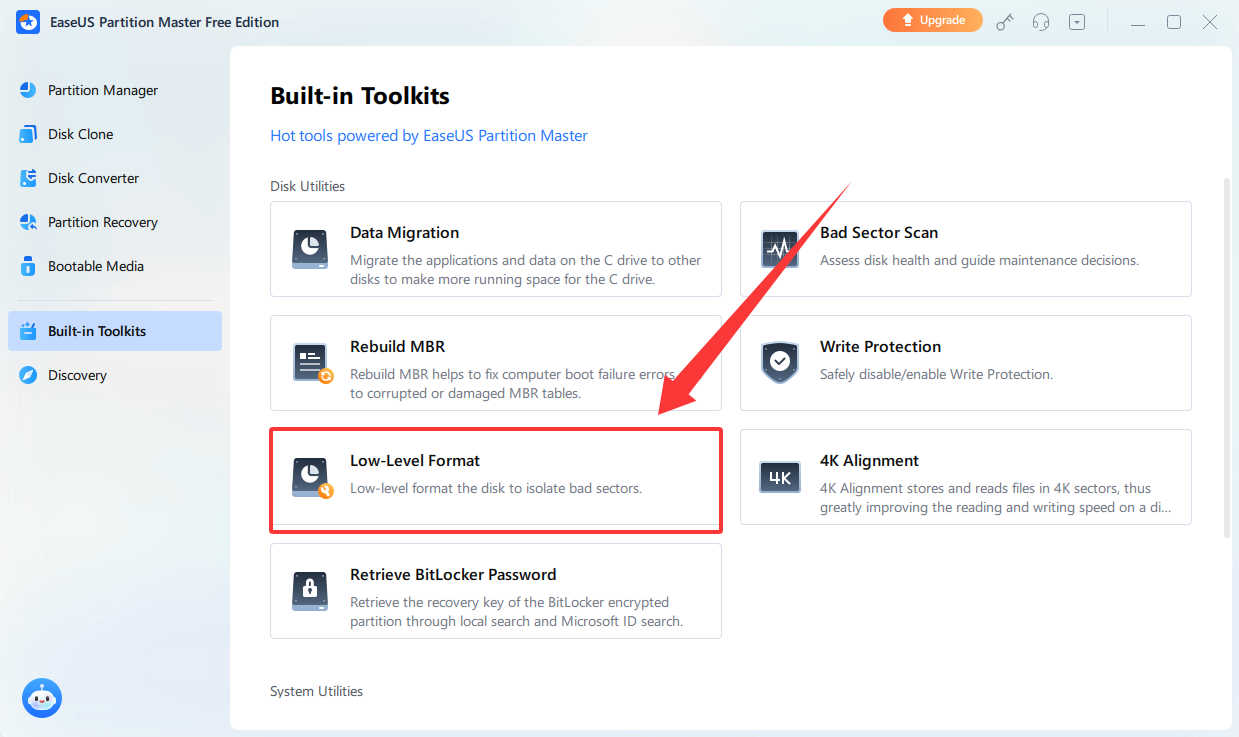 EaseUS Partition Master includes a 4K alignment function to optimize the performance of SSDs by aligning the 4K sectors. This feature can be found in the Toolkit.