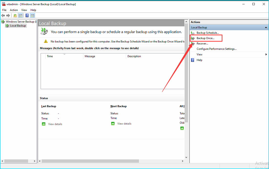 In the Windows Server Backup utility, click on Backup Once on the right-hand side.
