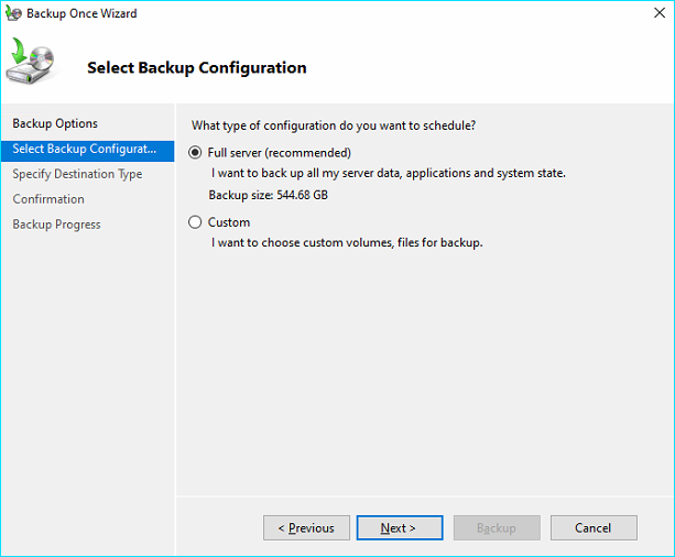 Click on Next and select Full server as the backup type and click Next.