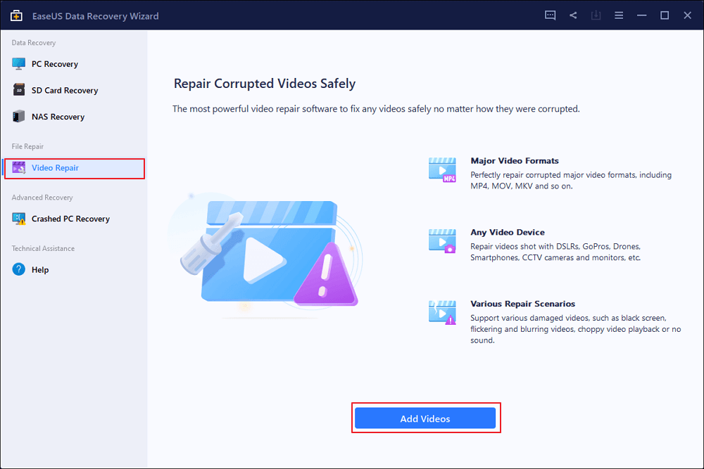 Step 1. Open Fixo on your local PC. Click "Video Repair" and add the corrupted MP4/MOV/AVI/MKV/3GP/FLV/MKV/WMV video files by clicking "Add Videos".
