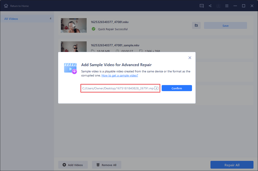 Step 4. If the quick repair fails, you should utilize the advanced repair mode. Click "Advanced Repair" and add a sample video. Choose "Confirm" to ensure.