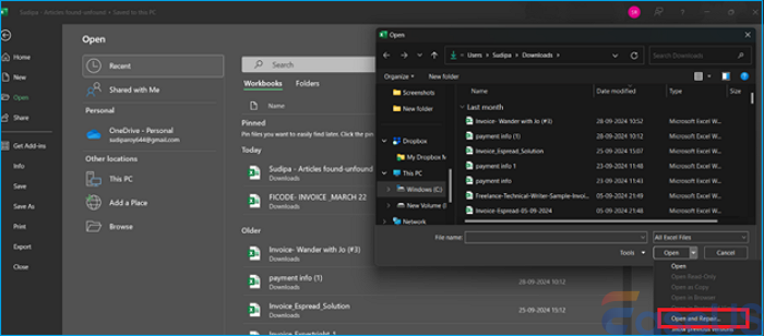 - Hit the arrow adjacent to the "Open" button, and hit "Open and Repair."