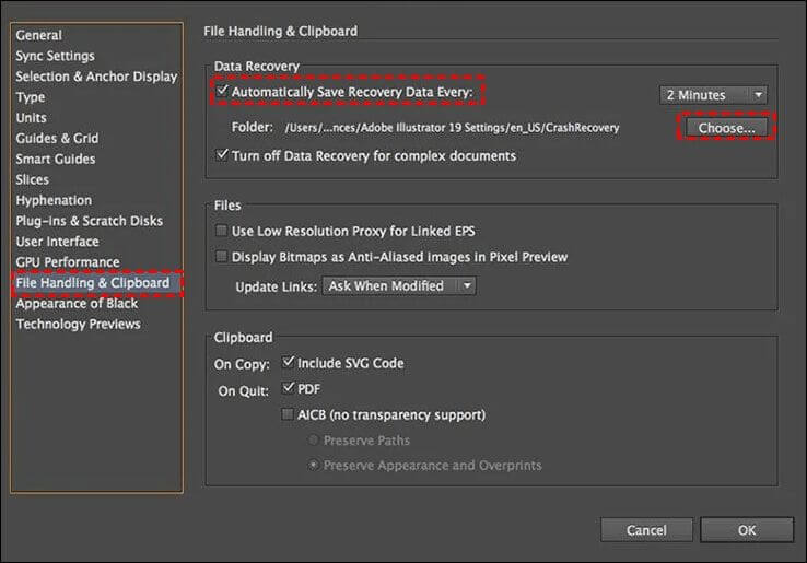 Step 3. Tap on Automatically Save Recovery Data Every option and select the time span. Then, click on Choose to decide the location path for the unsaved recovery file. Click OK to confirm.