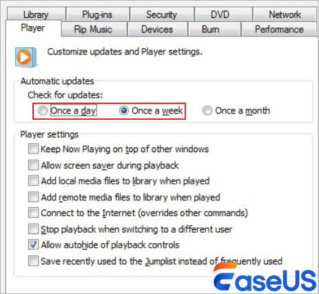 Step 2. In the "Player" tab, find "Automatic updates" and choose between "Once a day" or "Once a week."