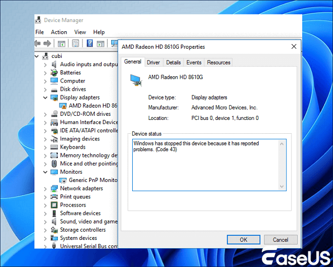 Step 3. View the Device Status. If it displays an error, such as Code 43, it indicates a video card issue.