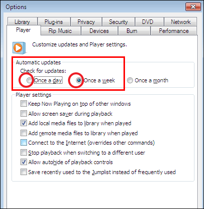 Step 2. In the Player tab, go to "Automatic updates" and check "Once a day" or "Once a week".