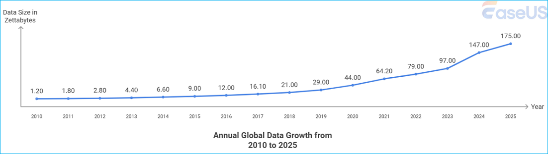 The rate of global data growth is staggering. According to predictions from IDC, the global data volume is expected to increase from 1.2 ZB in 2010 to 175 ZB by 2025. The annual growth rate of data generation is expected to remain around 40%.